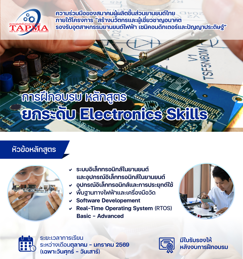 สมาคมผู้ผลิตชิ้นส่วนยานยนต์ไทย (TAPMA) ขอเชิญสมาชิกสมาคมฯ เข้าร่วมกิจกรรม SMEs LINK (Lean, Innovation, Network, and Knowledge Sharing) เพื่อส่งเสริมความร่วมมือ แลกเปลี่ยนองค์ความรู้ และเปิดมุมมองใหม่ในการพัฒนาอุตสาหกรรมยานยนต์สู่ความยั่งยืน กำหนดการ วันจันทร์ที่ 17 พฤศจิกายน 2568 เวลา 09.30 – 15.30 น. (เริ่มลงทะเบียนเวลา 09.30 น.) ณ ศูนย์พัฒนาและฝึกอบรม บริษัท ปูนซิเมนต์ไทย (แก่งคอย) จำกัด จังหวัดสระบุรี แผนที่ : https://maps.app.goo.gl/zsmi5a9MU1BvW5KH8 หมายเหตุ: จำกัดจำนวนผู้เข้าร่วมไม่เกิน 100 ท่าน