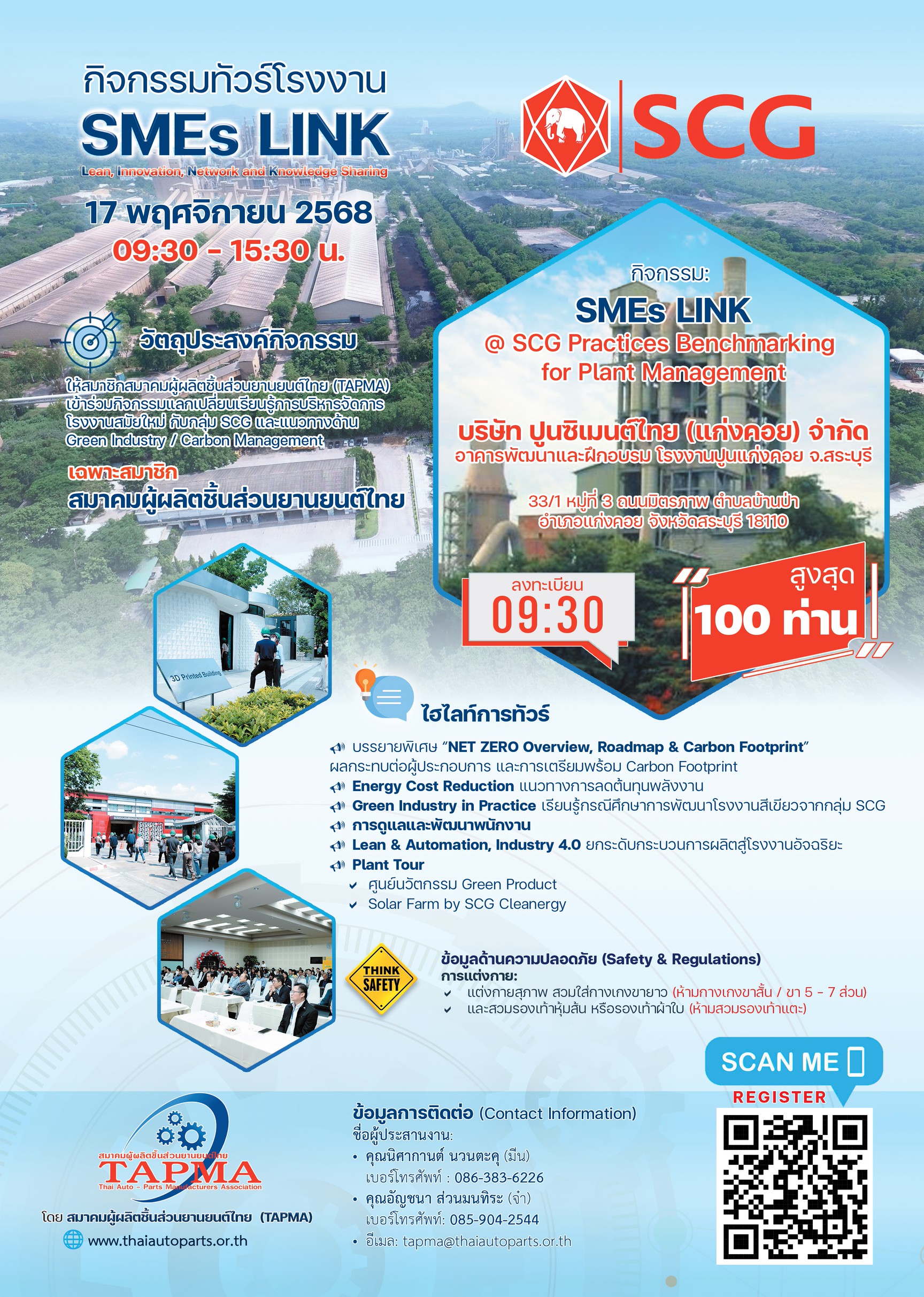 สมาคมผู้ผลิตชิ้นส่วนยานยนต์ไทย (TAPMA) ขอเชิญสมาชิกสมาคมฯ เข้าร่วมกิจกรรม SMEs LINK (Lean, Innovation, Network, and Knowledge Sharing) เพื่อส่งเสริมความร่วมมือ แลกเปลี่ยนองค์ความรู้ และเปิดมุมมองใหม่ในการพัฒนาอุตสาหกรรมยานยนต์สู่ความยั่งยืน